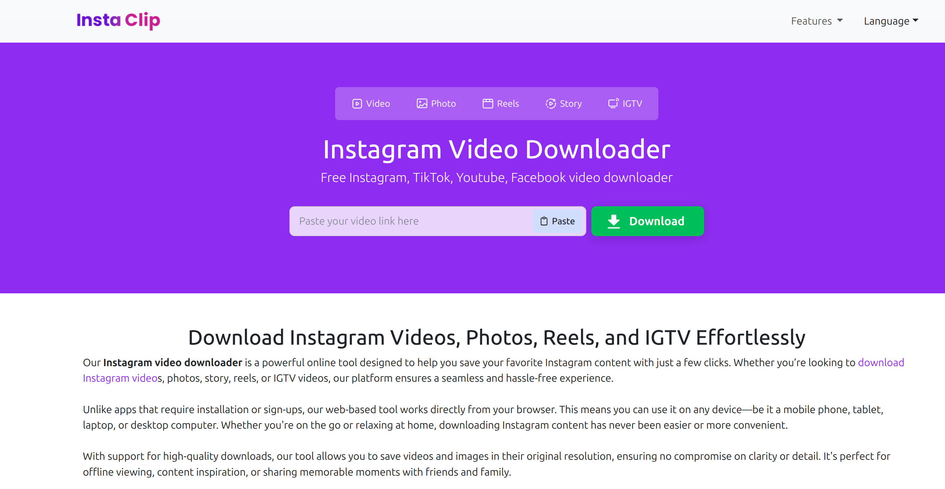 InstaClip focuses heavily on video content, including Reels and IGTV. For investigations where video metadata or content preservation is key, this tool provides a straightforward download mechanism alongside the viewer.