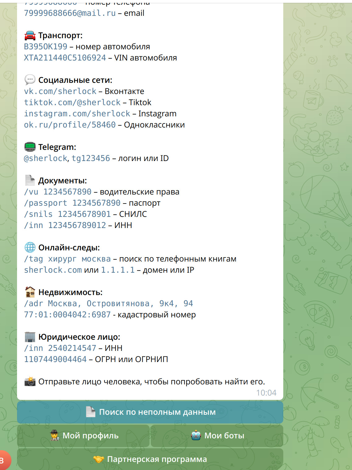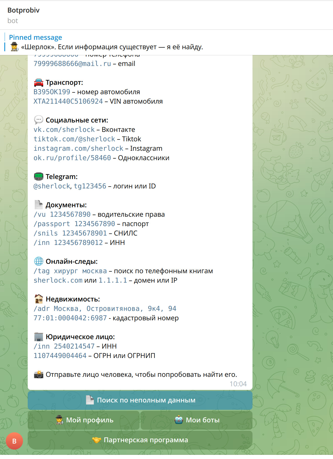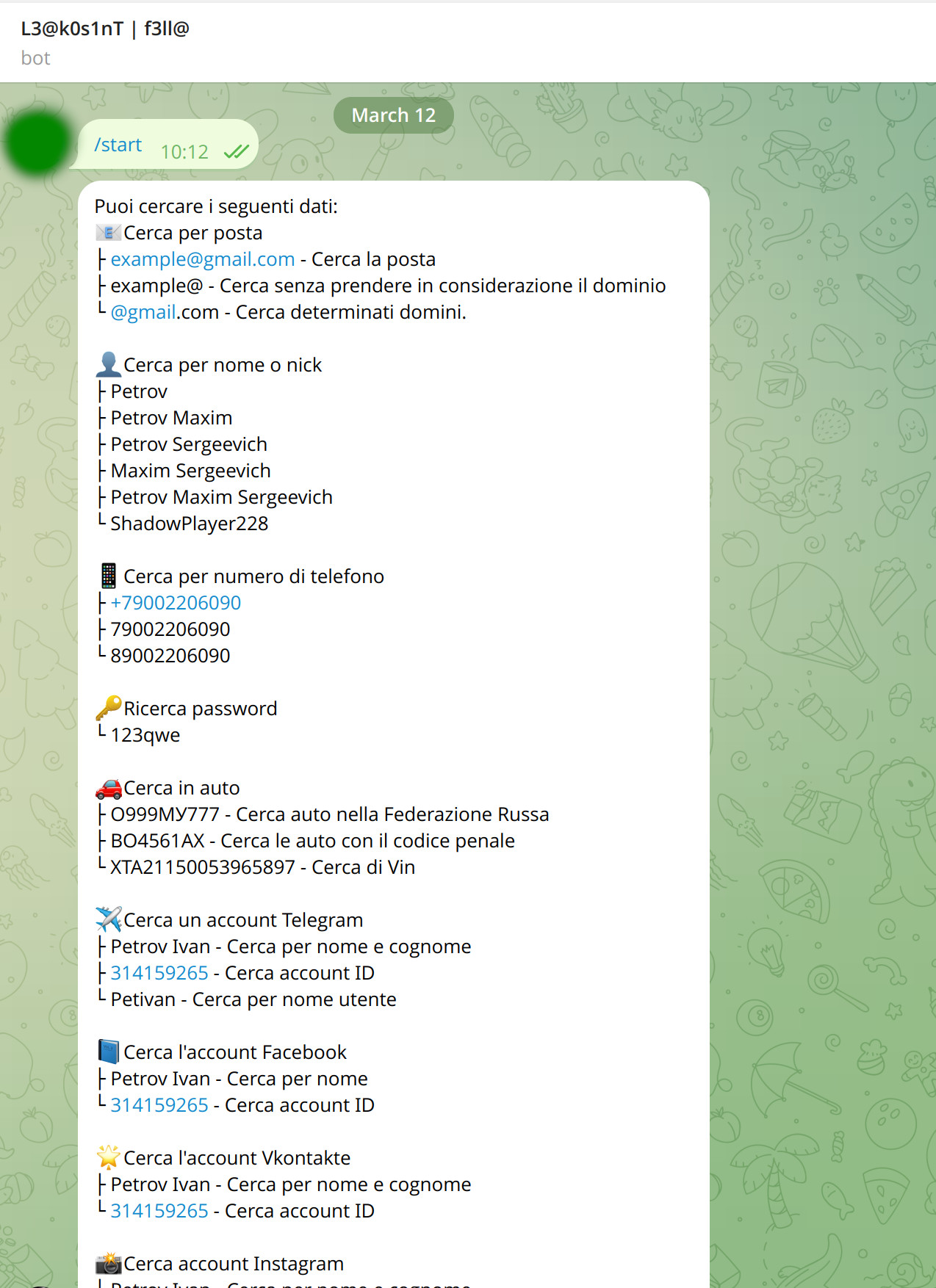 The Vibe: Same operator group as probiv43bot. Same data sources. Same crypto payment model. Gets shut down regularly—always keep the backup invite link handy because the current handle might vanish in days or weeks.